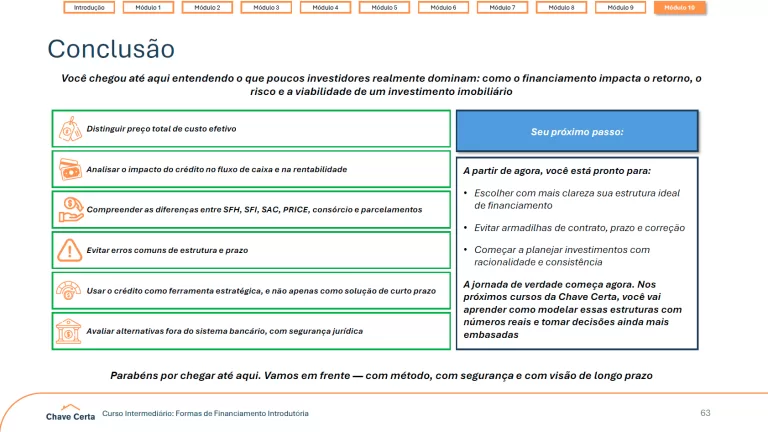 Ao terminar o curso, você terá estrutura e clareza para avaliar qualquer proposta de financiamento ou negociação de crédito com incorporadoras.