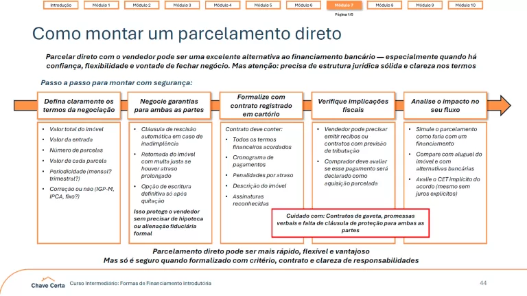 Exploramos modelos fora do padrão bancário, como entrada parcelada + saldo financiado, ou negociações diretas com o vendedor. Você aprende os riscos, oportunidades e como montar uma estrutura segura nesses casos.