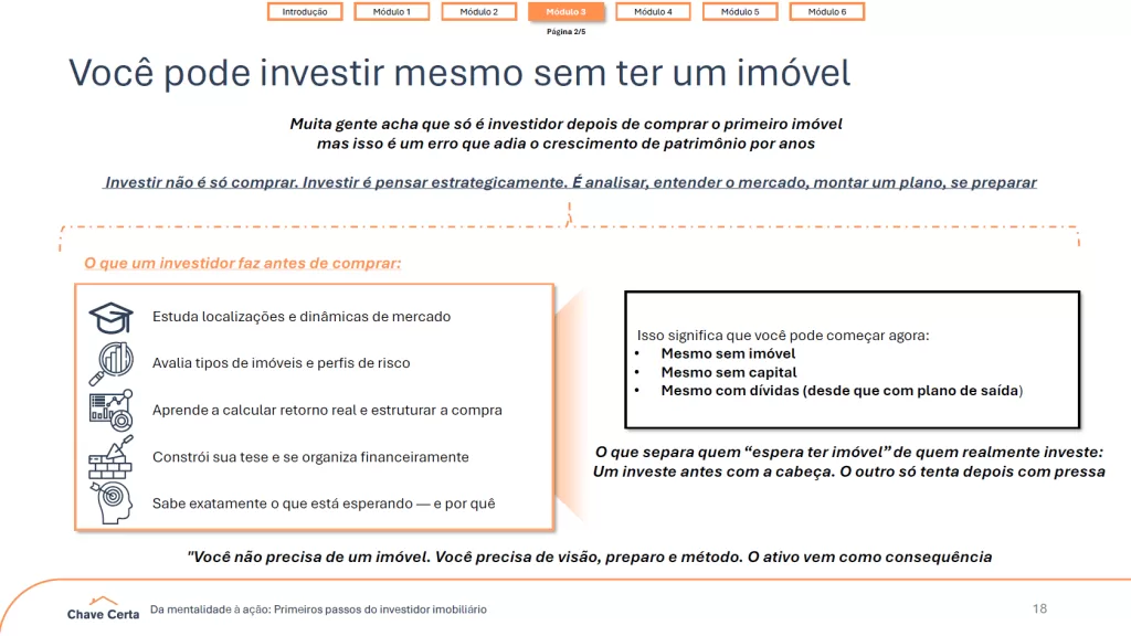 Investir em imóveis vai muito além de comprar um bem. Aqui você começa a moldar a mentalidade necessária para avaliar riscos, tomar decisões com autonomia e pensar como um verdadeiro investidor de longo prazo.